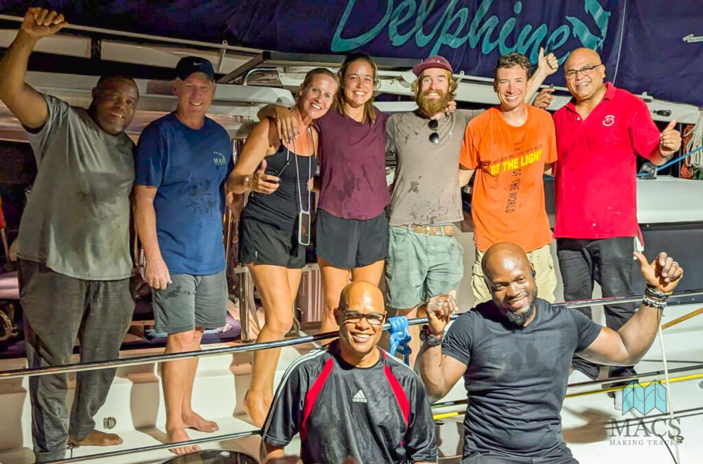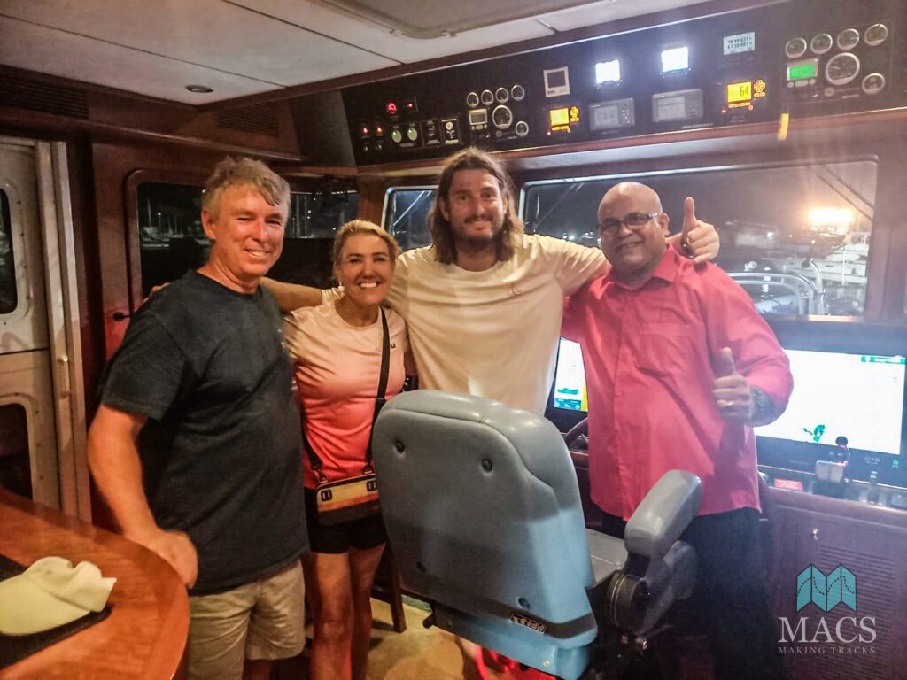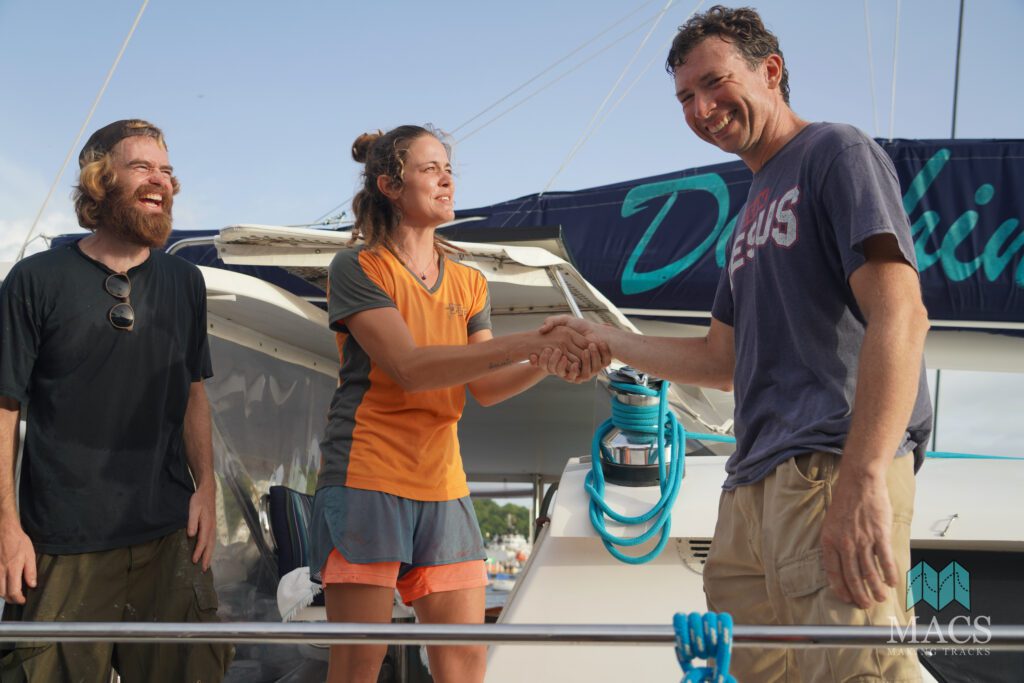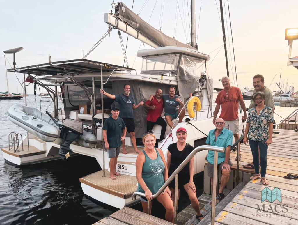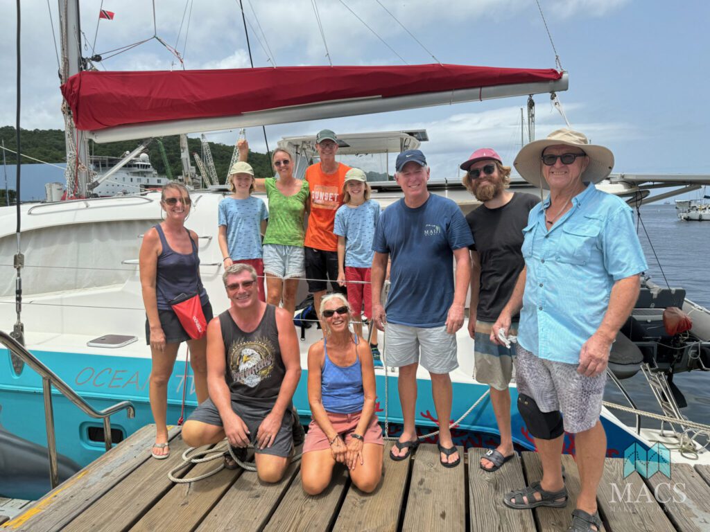 Jeremy of m/v Optimist Creed (second from right) takes a moment to say goodbye to us as he prepares to depart on his family’s 63-foot Nordhaven, which is loaded down with many thousands of pounds of supplies.