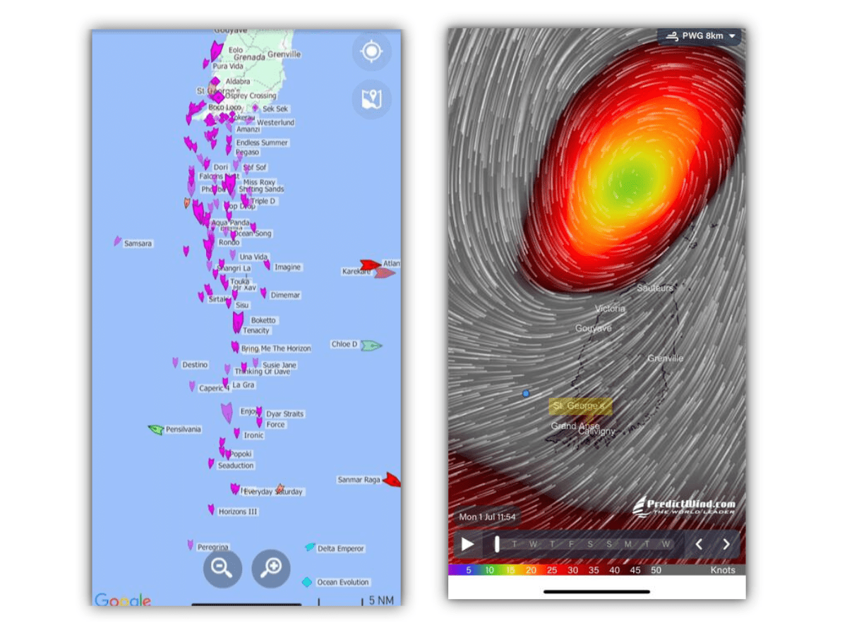 On the left is the exodus of boats from Grenada to Trinidad. Image from Chris Schramm. On the right is a view of what we are running from. Image from PredictWind.