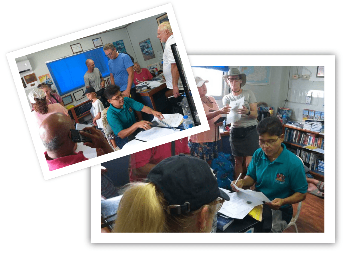 Jesse James and other volunteers help cruisers clear into Customs and Immigration. Dr. Lambie, a local veterinarian shown far right wearing green, generously donates her time for boats with pets. Photos from Sharon Rose.