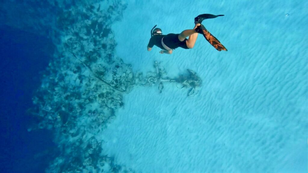 During the 18th and 19th centuries, many merchant vessels and salt-raking ships frequented the area. It was common for ships to “slip” or cut their anchor cables during sudden storms to avoid being driven onto the reef. This particular anchor is famous for its massive iron chain that stretches across the sandy bottom and disappears over the wall. This suggests the ship was likely positioned at the edge of the shelf when it was forced to abandon the anchor.